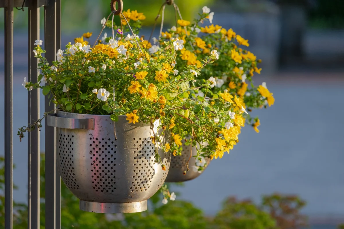 Vor allem weil Siebe viele Löcher haben, sorgen sie für eine sehr gute Drainage. Das verringert das Risiko, die Pflanze zu übergießen. Außerdem sind Siebe – egal ob aus Metall oder Kunststoff – leicht. Man kann sie aufhängen, um Platz zu sparen. Außerdem benötigen Siebe aufgrund ihrer Konstruktion und ursprünglichen Funktion keine großen Umbauten, um Blumentöpfe zu ersetzen.